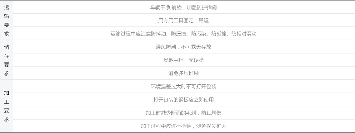 訂貨時(shí)用戶需提供:產(chǎn)品名稱(鋼板或鋼帶)、牌號(hào)、表面處理方式、表面質(zhì)量級(jí)別、重量、包裝方式等信息;選擇產(chǎn)品牌號(hào)及表面處理方式時(shí)請(qǐng)確認(rèn)或驗(yàn)證產(chǎn)品使用時(shí)的成型要求、沖壓要求、防腐要求、防止因所訂牌號(hào)和表面處理方式對(duì)應(yīng)的產(chǎn)品性能不滿足加工要求。